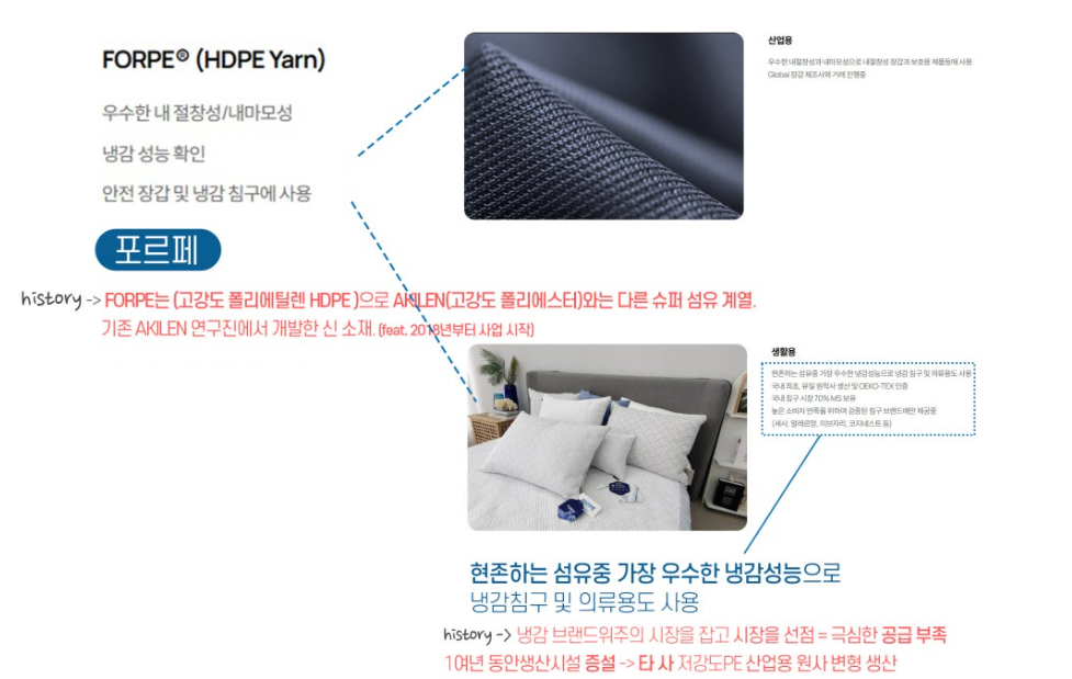 폴리에틸렌은 접촉 냉감성 소재로서 몸의 열을 빠르게 흡수하는 소재입니다. 단점이 있다면 원단 가격이 비싸다는 점입니다. 이 때문에 폴리에틸렌 소재 함유가 높을수록 원간 가격이 높아진다고 합니다. 폴리에틸렌은 섬유 외에도 배수관, 식품용기 등에도 쓰입니다.