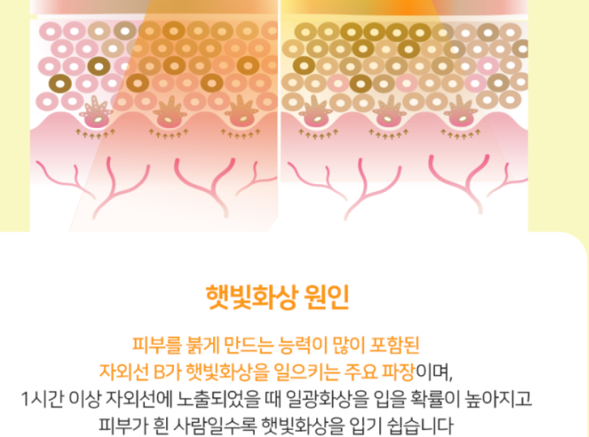 햇빛 화상은 자외선에 과도하게 노출되어 피부 염증반응 및 붉고 따가운 증상이 나타나는 것인데요.