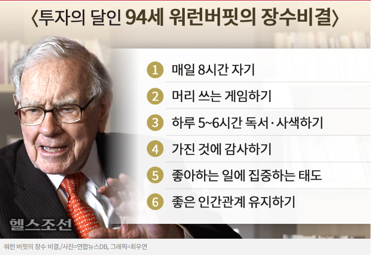 충분한 수면, 머리쓰는 게임하기, 가진것에 감사하기, 좋은 인간관계 유지하기, 좋아하는 일에 집중하는 태도가 버핏의 장수 비결이라고 합니다.