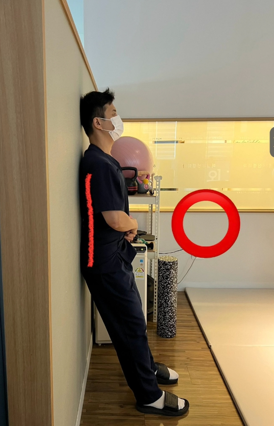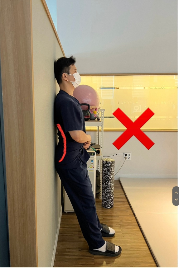 이 때 벽에 등을 대는 것만으로도 뇌의 자세인식에 대한 피드백을 보내서 과도하게 굽어지는 것을 방지하며, 체간의 안정성 때문에 좋아진다고 합니다.