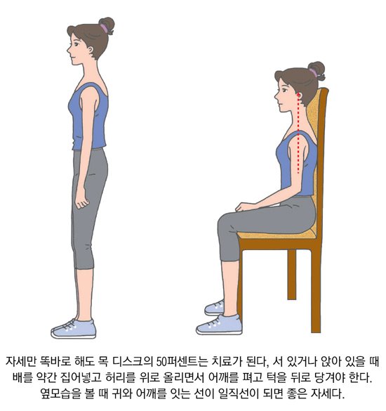 또한, 평소 앉은 자세도 중요한데요. 허리를 펴고 턱을 당기는 자세를 취해야 합니다.