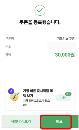 그리고 쿠폰번호를 입력하면 네이버 기프티쇼 쿠폰 등록이 완료되었습니다.