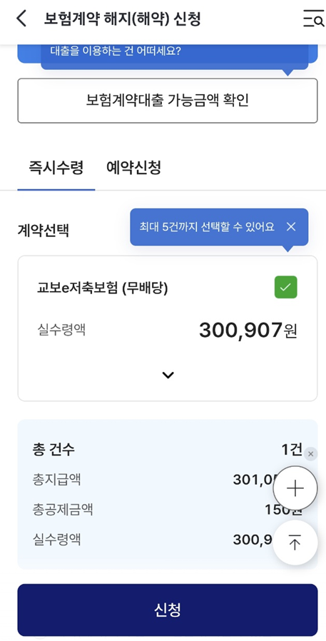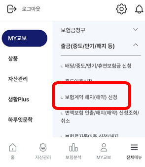 먼저 앱에서 my교보 - 보험계약 해지(해약) 신청 메뉴로 들어갑니다.