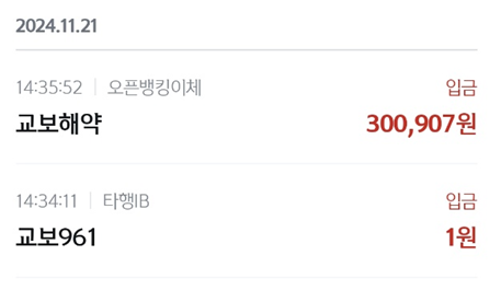 교보해약이라는 이름으로 입금되었습니다. 10만원씩 3번 입금하고 이자는 약 1천원 정도가 붙었구요. 세금을 내니 300907원을 받았습니다.