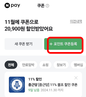 그리고 상단에 녹색으로 되어 있는 포인트 쿠폰 등록 메뉴를 클릭하시면 됩니다.