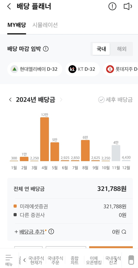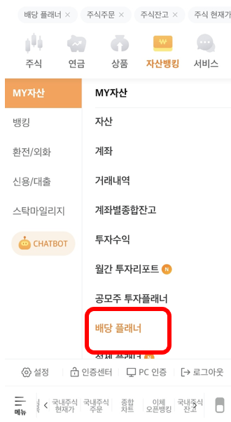 미래에셋증권앱에서 배당 플래너를 검색하거나 자산 뱅킹 - My자산 - 배당 플래너 화면에서 확인 하실 수 있습니다.