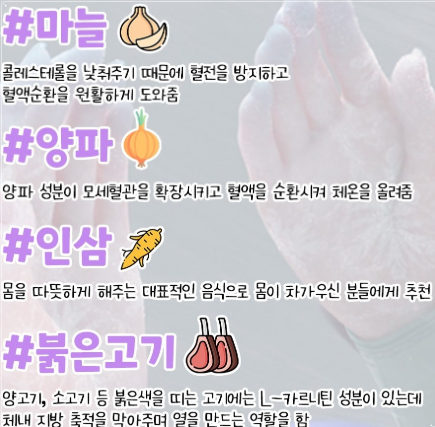 혈전을 방지하는 마늘, 모세혈관을 확장하는 양파, 몸을 따뜻하게 하는 인삼 등이 좋은 효과가 있다고 합니다.