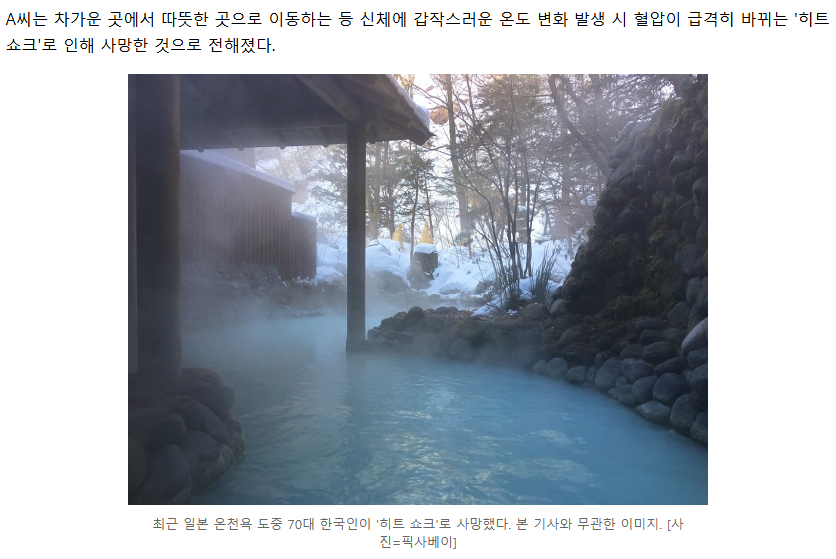 특히 일본은 온천과 목욕문화가 발달한 만큼 매년 수많은 사람이 히트쇼크로 사망한다고 합니다.