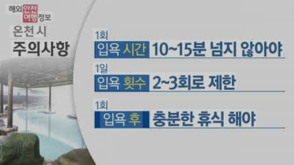 특히 고령이거나 고혈압 등 질환이 있을 경우 더욱 조심해야 한다고 합니다. 특히 겨울철에 온천에 들어가게 되면 온도차이가 크기 때문에 더욱 위험합니다.