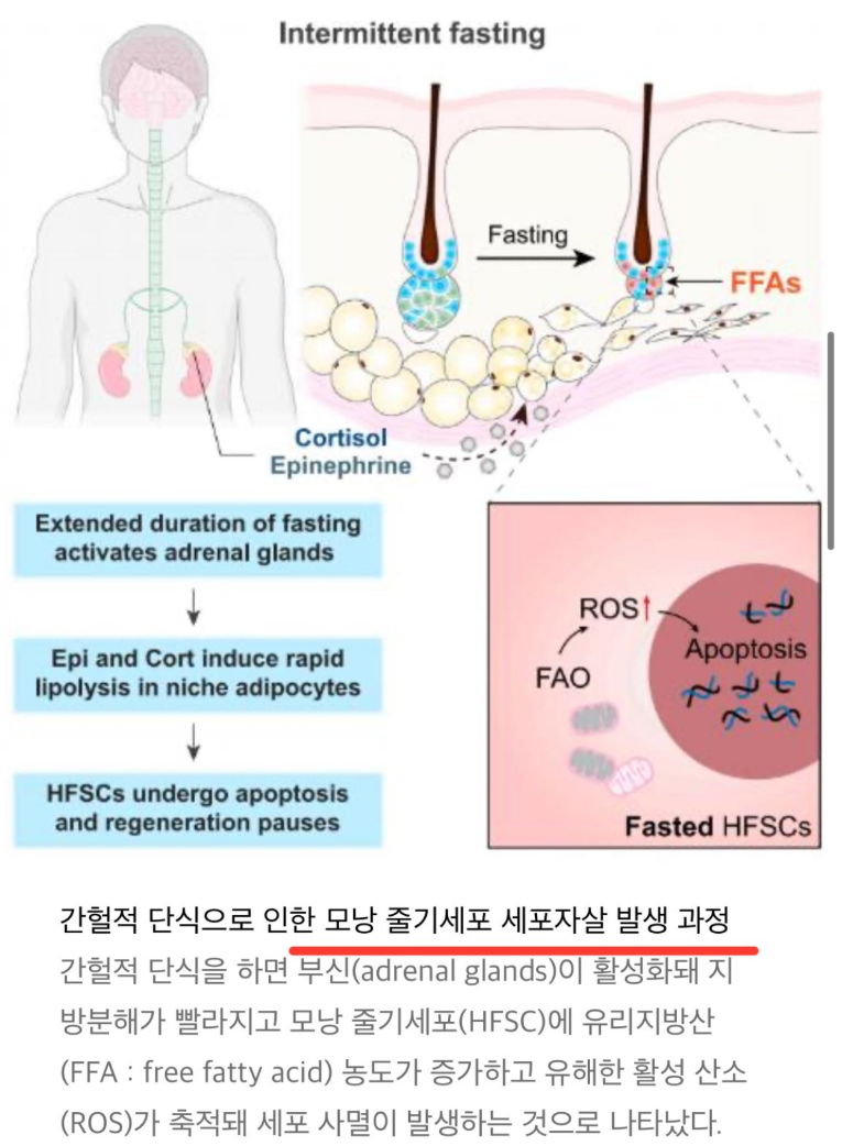 간헐적 단식으로 축적된 활성산소가 모낭 줄기세포(HFSC)의 세포 사멸(apoptosis)을 일으키기 때문이라고 합니다. 다만, 사람은 생쥐와 모발 성장 패턴이 달라 그 정도가 쥐보다는 크지 않았지만 확실히 모발 성장에는 지장이 생겼습니다.