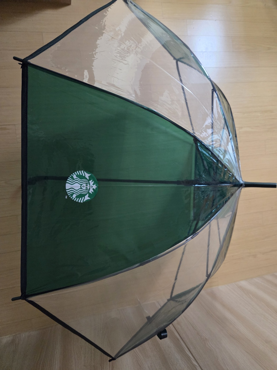 펼쳐서 보면 스타벅스 로고가 있는 투명우산입니다.
