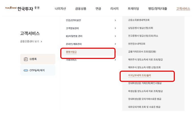 메뉴는 고객서비스 - 증명서 발급 - 외국납부세액 조회/출력 메뉴에서 확인할 수 있습니다.