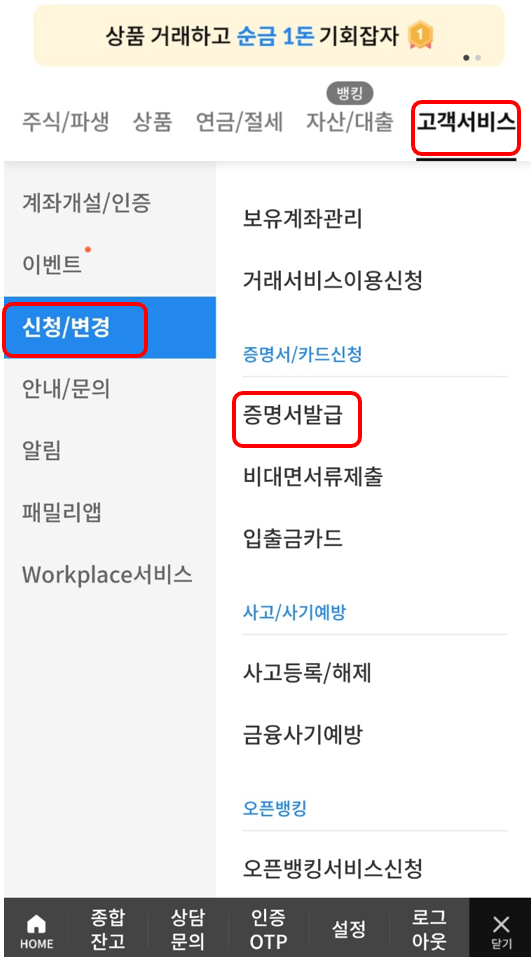 예를 들어 삼성증권은 앱에서만 가능하고, 고객 서비스 - 신청/변경 - 증명서 발급