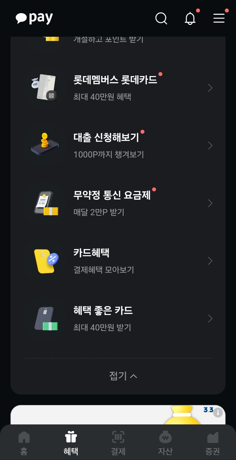 이번달 카카오페이 롯데카드는 심플하네요. 카카오페이 - 혜택 - 혜택좋은 카드에서 확인할 수 있구요.