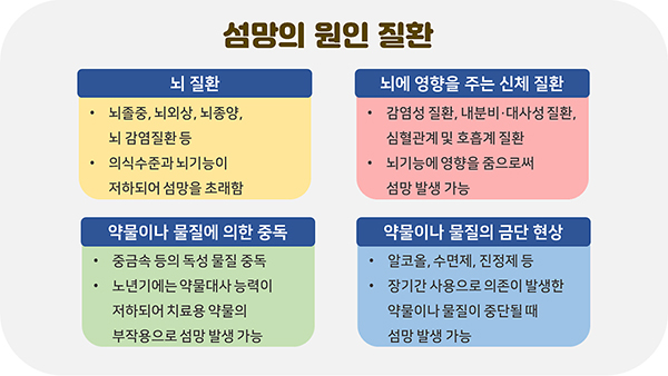 노인이 골절, 외상 등으로 수술을 받는 경우 섬망이 발생할 가능성이 높으며 노인의 뇌혈관질환,