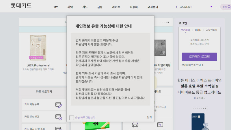 현재 롯데카드에서는 피해 예방을 위해 비밀번호 변경, 재발급, 탈회와 관련한 문의 대응을 위해 오후 10시까지 고객센터를 연장 운영 중인 상황입니다. 그리고 롯데카드 앱과 홈페이지에서 비밀번호 변경, 해외 거래 차단, 카드 재발급을 위한 간편 링크를 마련해 고객이 쉽게 보안 조치를 진행할 수 있도록 지원하고 있습니다.
