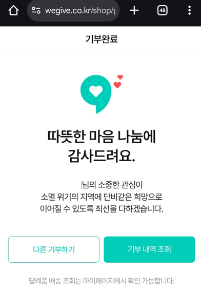 정상적으로 결제까지 완료하면 아래처럼 기부 완료가 됩니다.