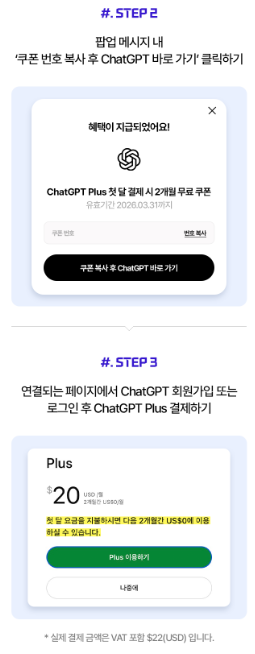 쿠폰 다운로드 후 연결되는 페이지에서 회원가입 또는 로그인 후 ChatGPT Plus를 결제하면 된다고 합니다.
