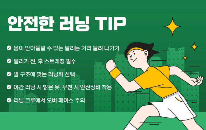 또한 발 구조에 맞는 알맞는 러닝화를 선택하고 야간 러닝시에는 잘 안보일 수 있으니 밝은 옷을 입는 것이 좋ㅅ브니다.