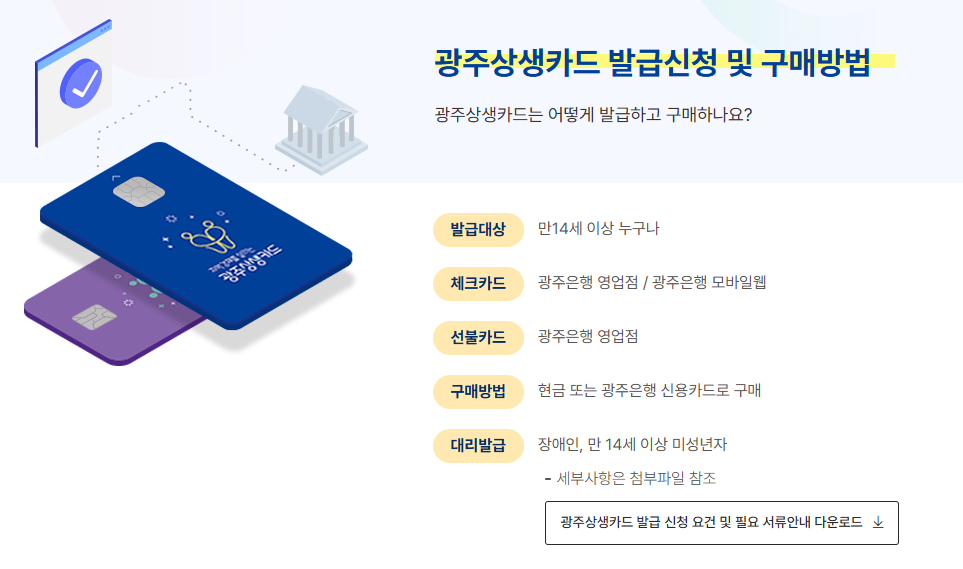 광주상생체크카드는 전통시장 0.2%, 오매서비스 업종 5개 업종 5% 캐시백, 금융수수료 면제, 당행ATM 출금수수료 월 3회 면제 혜택을 제공합니다.
