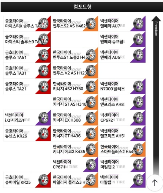 일반적으로 타이어 계급표는 아래와 같은데요. 금호/한국/넥센 타이어가 대표적입니다.