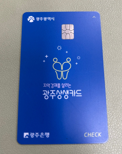 광주상생카드는 광주광역시 지역화폐로 광주은행이 운영하며, 광주광역시 내 IC 결제 가맹점에서 현금처럼 사용 가능한 선불카드와 체크카드 형태입니다. 카드를 신청하면 아래처럼 실물 카드가 오는데요. 지역 온누리 카드라고 생각하시면 됩니다.