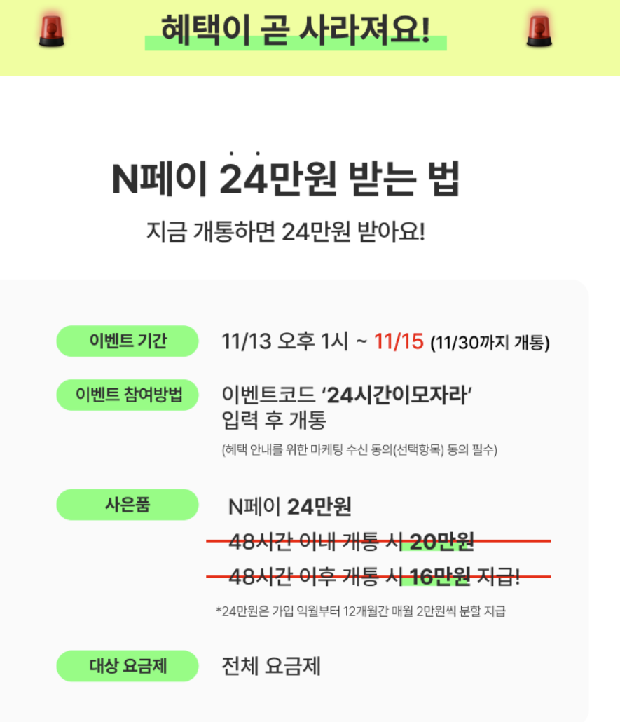 13일부터 15일까지 이벤트코드 '24시간이모자라'를 입력하고 개통만하면 되는데요.