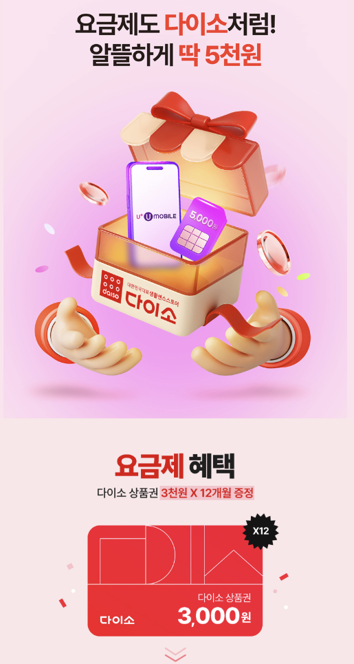 추천 요금제는 12개월간 5천원 다이소 요금제를 만들면 다이소 상품원 3천원을 매달 주기 때문에 이게 가장 최선인것 같습니다.