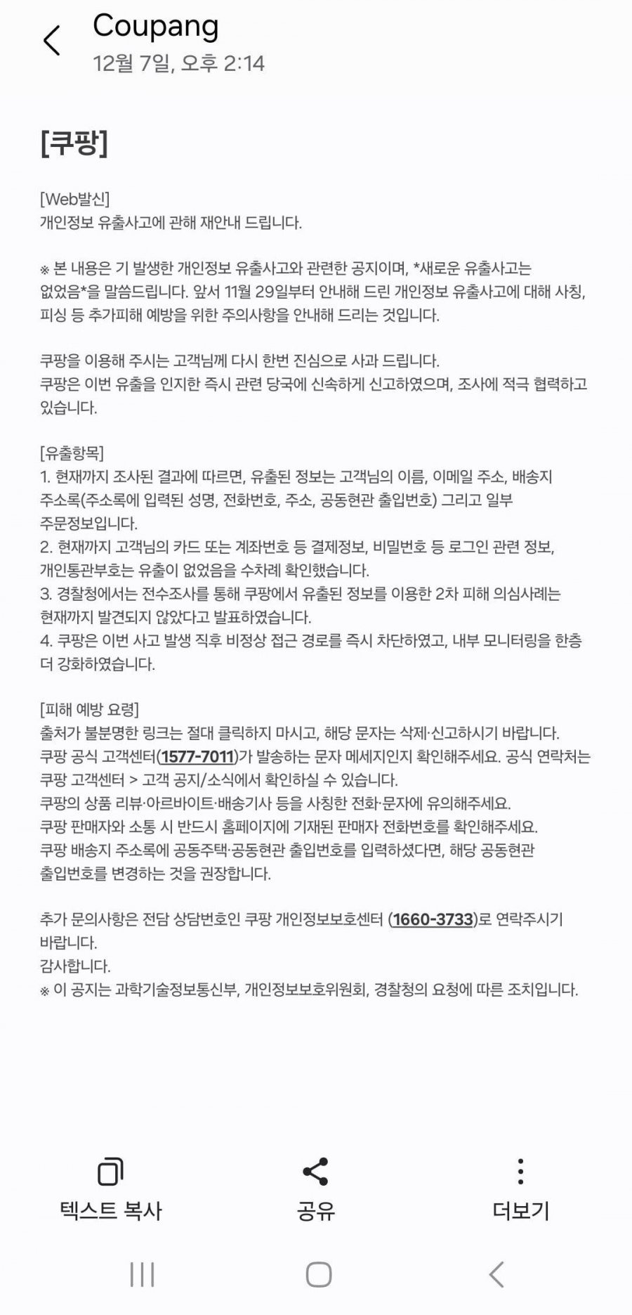 쿠팡 가입정보, 개인정보 유출 안내 문자 캡쳐 정도가 있으면 된다고 합니다.