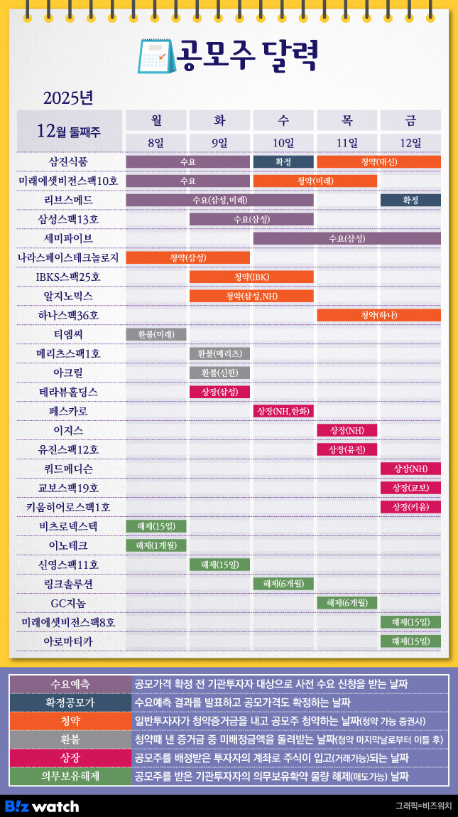 안녕하세요! 2025년 12월 둘째 주(8일~12일) 공모주 일정을 정리해 드립니다. 이번 주는 청약, 수요예측, 그리고 신규 상장까지 일정이 꽉 차 있어 투자자분들이 바쁘게 움직이셔야 할 것 같습니다.