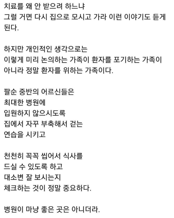 라는 점을 강조하는 것입니다. 어르신들은 환경 변화에 매우 취약하기 때문에, 입원을 결정할 때는 실보다 득이 큰지 냉정하게 판단해야 한다는 조언입니다.