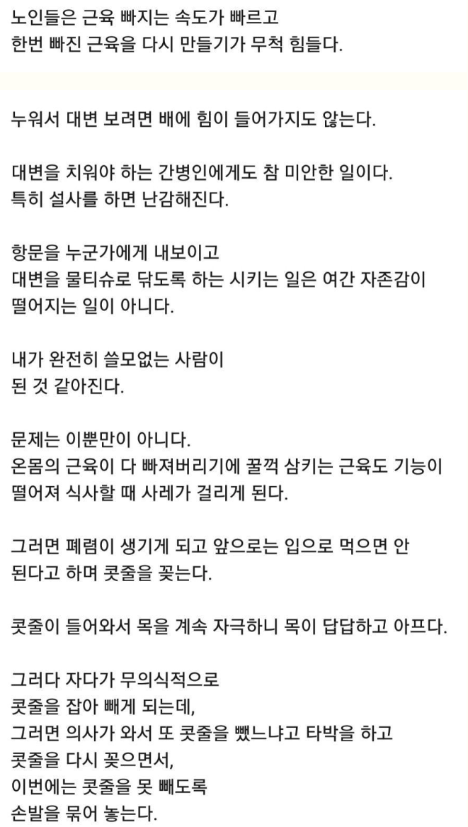 콧줄 및 소변줄: 식사가 어렵거나 화장실 가기 힘들다는 이유로 삽입하는 각종 관(Tube)들은 어르신을 빠르게 '와상 상태(누워만 있는 상태)'로 만듭니다.