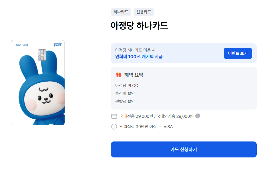 아정당 하나카드는 하나카드와 아정당이 콜라보해서 만든 PLCC카드인데요.