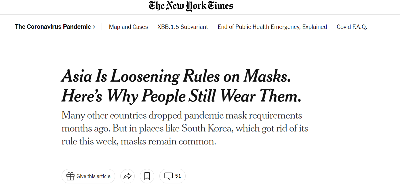 최근 뉴욕타임스(NYT)는 아시아 정부들이 마스크 착용 규정을 완화해도 국민들이 마스크를 벗지 않고 있다고