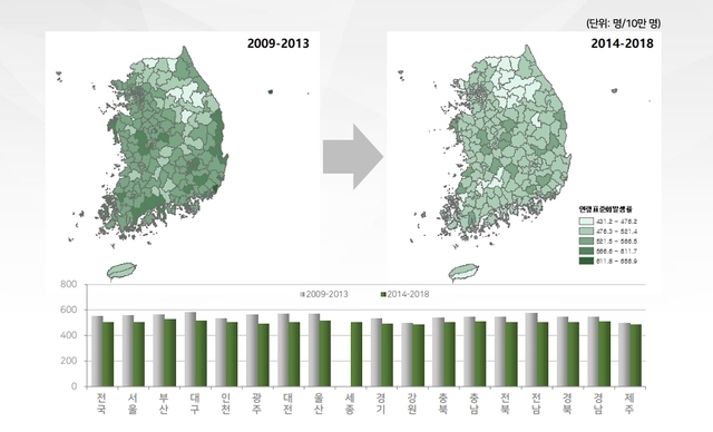 2014∼2018년 지역별 암발생 통계를 발표했습니다.