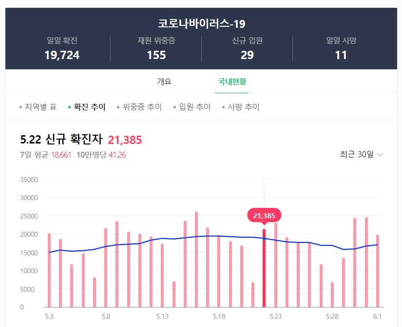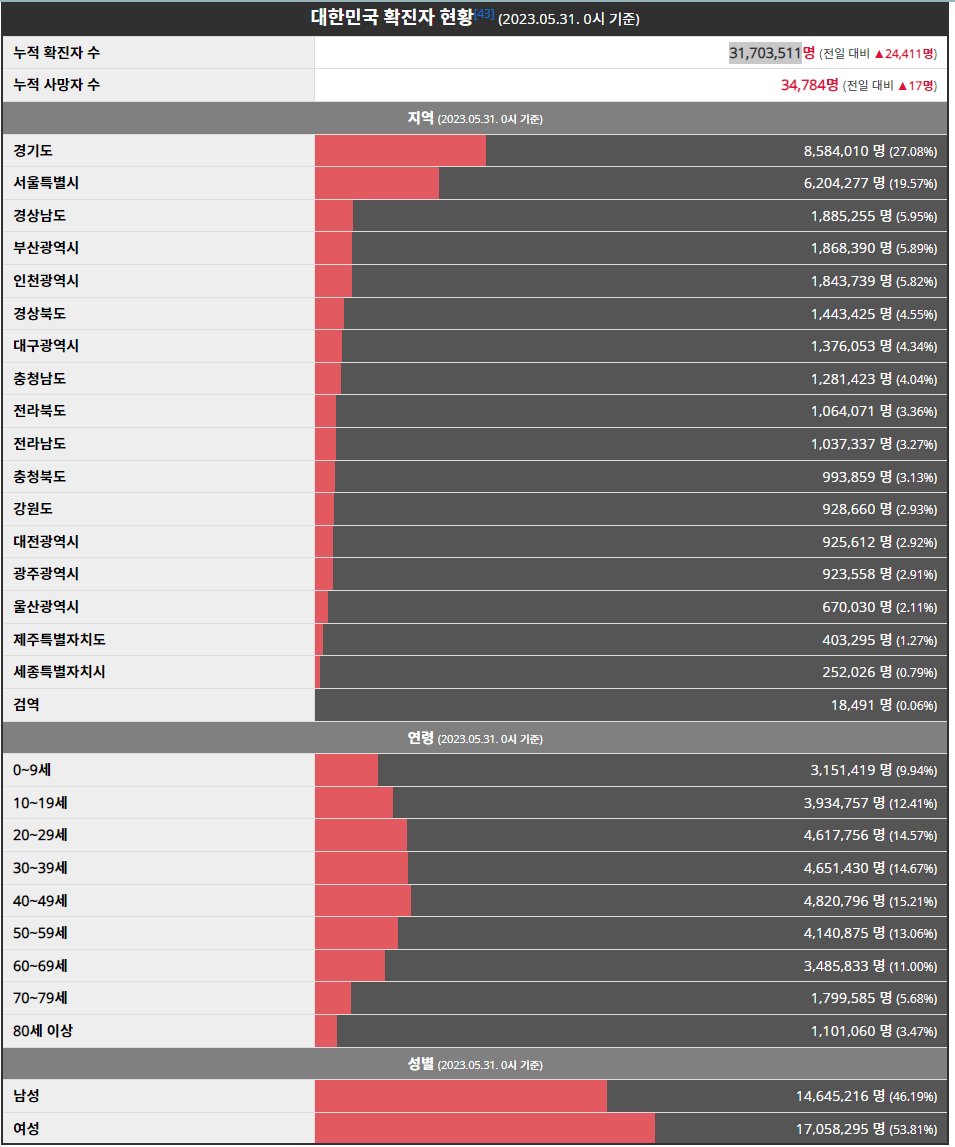 그간 대한민국 인구 약 60%인 31,703,511명이 코로나19에 감염됐고, 3만4000여명이 코로나19로 목숨을 잃었습니다.