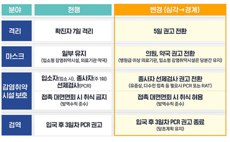 코로나19 위기 경보 수준이 '심각'에서 '경계'로 하향 조정됨에 따라 격리 의무도 권고로 바뀌게 되었습니다.