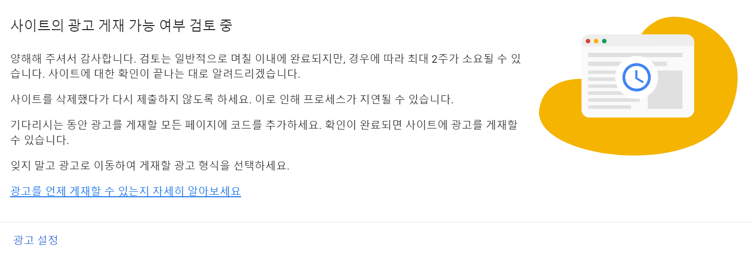 아래와 같이 광고 게재가 준비되지 않은 사이트라며 에러가 발생하였습니다.