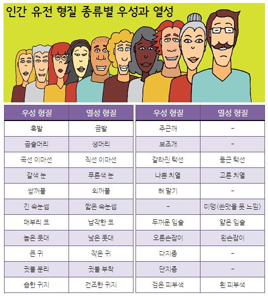 이런 유전형질에서는 우성과 열성이 있는데, 이들이 짝을 이룰 경우 우성 유전인자가 발현되며,