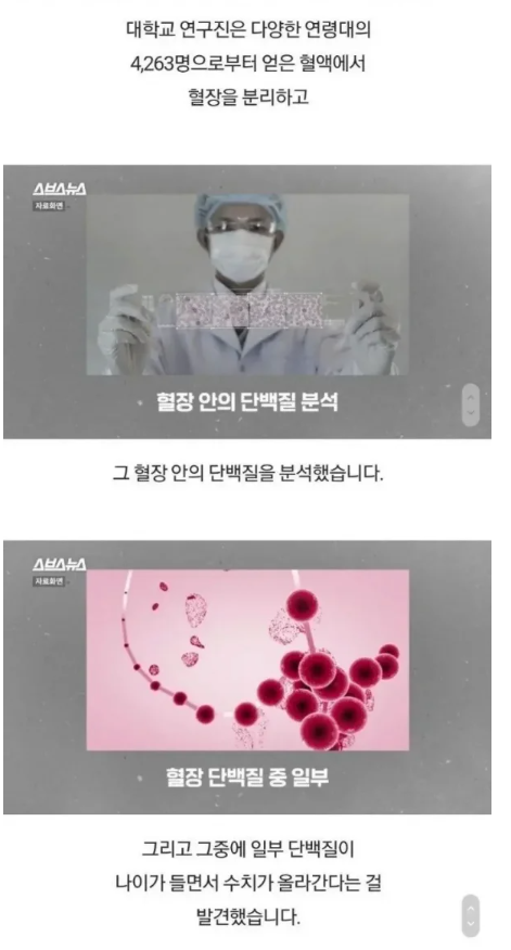 그래서 한국 나이로 30대 중후반이 되면 폭삭 늙는 것을 체감하게 되는 것인데요. 연구진은 다양한 연령대의 혈액에서 혈장을 분리하고 조사하였더니 특정 연령대에서 단백질 수치가 올라가는 것을 확인하였습니다.