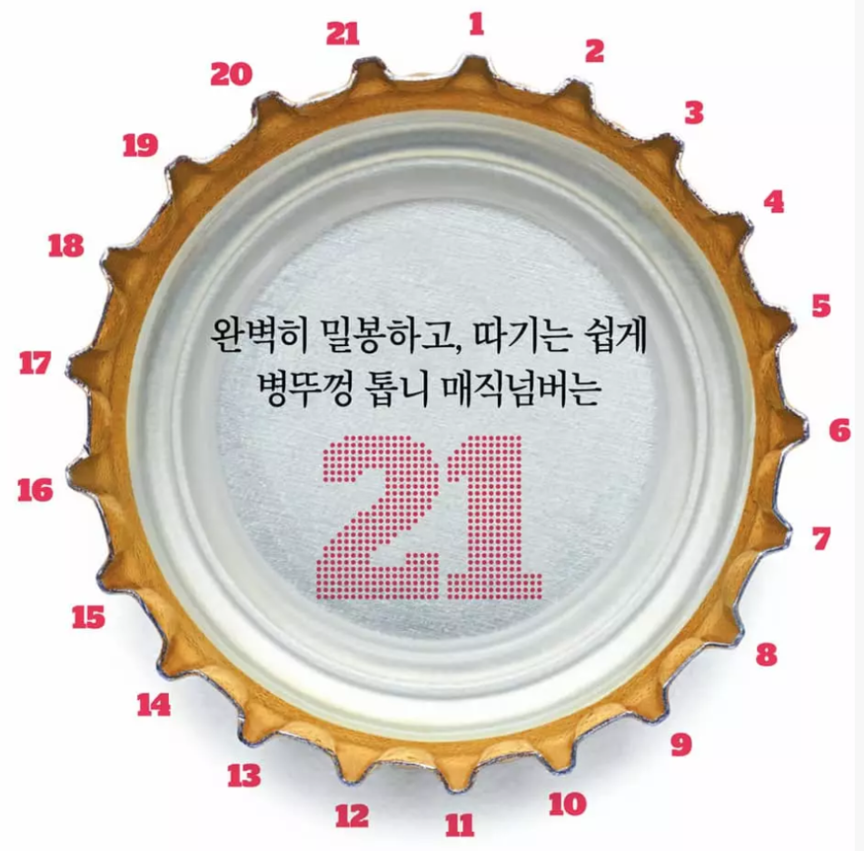사실 반드시 그래야 하는 건 아닙니다. 우리가 흔히 보는 1.5ℓ 페트병에 든 맥주는 플라스틱으로 된 ‘트위스트 캡(Twist cap)’을 병뚜껑으로 사용하고 있습니다. 놀라운 사실은 트위스트 캡도 안쪽 톱니 수는 21개라고 합니다.