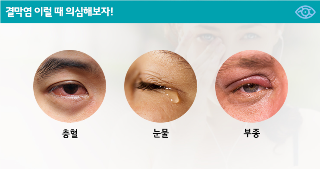 눈의 흰자위 부분과 눈꺼풀 안쪽을 덮고 있는 얇은 막에 바이러스나 세균, 알러지 등으로 염증이 생기는