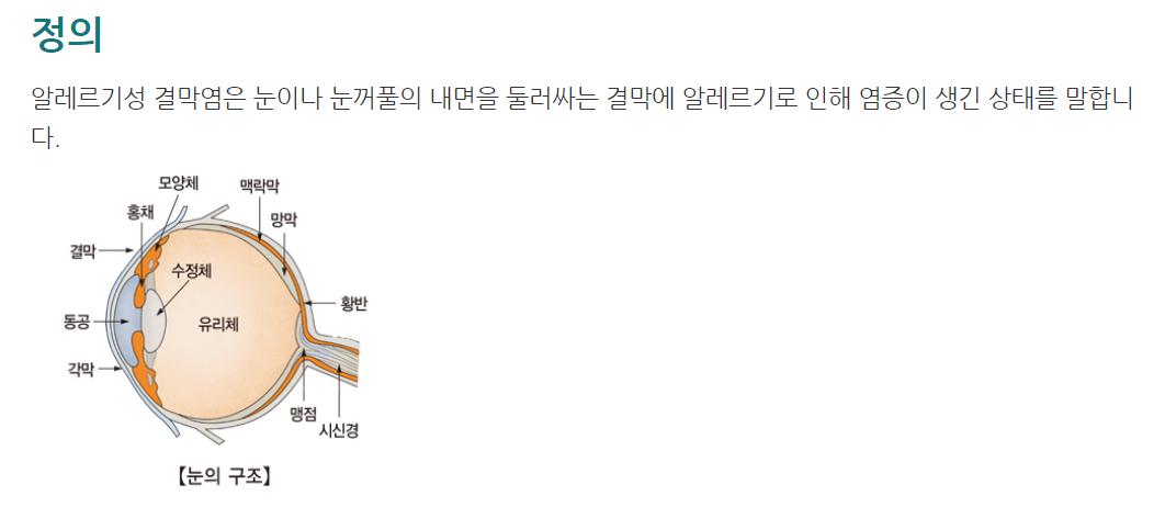 앞서 살펴본 결막염 중 알레르기 물질로 인하여 염증이 생긴 결막염을 뜻합니다.