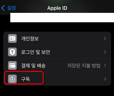 설정의 상단에 있는 본인 Apple ID 메뉴로 진입한 다음 구독 메뉴로 들어갑니다.