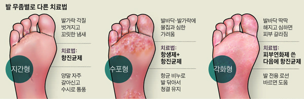 발 무좀의 종류는 지간형, 수포형, 각화형으로 나눠지는데요.