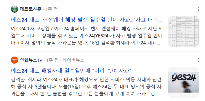 yes24는 지난 6월 9일부터 랜섬웨어에 해킹을 당했다고 합니다.