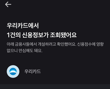 우리카드의 조회라는 것을 눌러보면 아래처럼 우리카드에서 카드 개설하기 위해서 조회했다는 것을 확인할 수 있습니다.