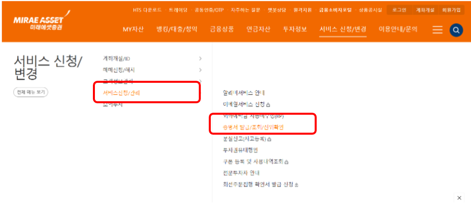 예를 들어 삼성증권은 앱에서만 가능하고, 고객 서비스 - 신청/변경 - 증명서 발급