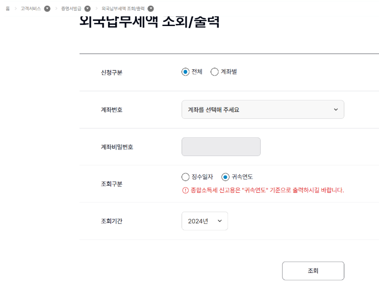 메뉴는 고객서비스 - 증명서 발급 - 외국납부세액 조회/출력 메뉴에서 확인할 수 있습니다.