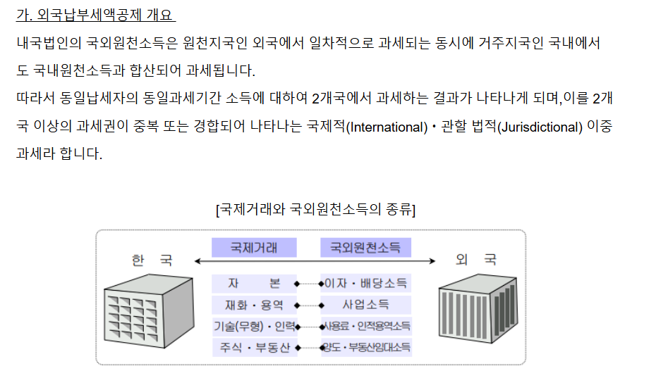 해외에서 납부한 세금을 한국에서 납부할 세금에서 일정 부분 공제해주는 제도입니다.